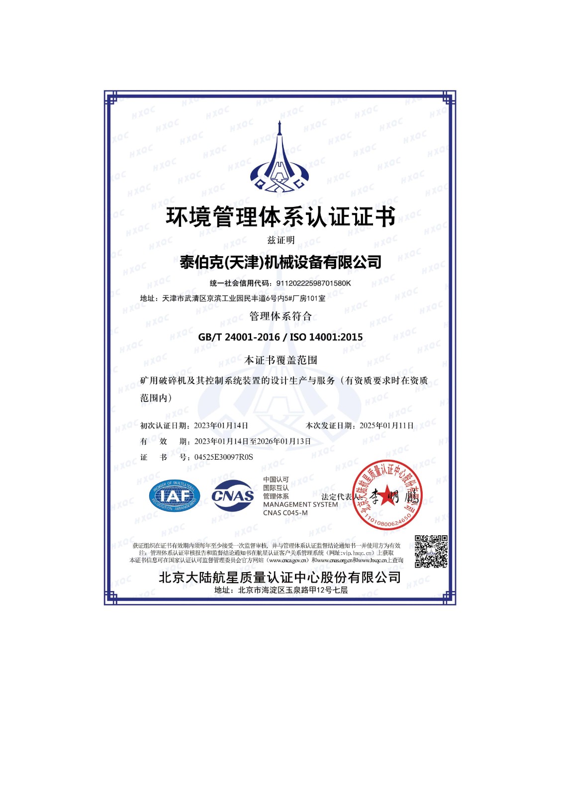 環(huán)境管理體系證書